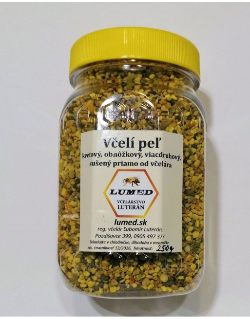 Slovenský prírodný kvetový obnožkový sušený včelí peľ viacdruhový /peľové guličky, včelí chlieb/ priamo od včelára. Obnôžkovaný včelí peľ peľ získavame pomocou peľochytov priamo vo včelom úli. Peľ sušený v špeciálnej sušičke pri nízkej teplote do 38°C šetrným spôsobom.